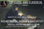 | UP CLOSE AND CLASSICAL - SAN PEDRO - Presents: Oboe quartets: Mozart, Britten, Moeran, Druschetzky - San Pedro Saturday, 1/31/2026 Oboe quartet: Rong-Huey Liu, oboe, Limor Toren, violin, Alicja Blanquart, cello and Nicholaus Yee, viola will present oboe quartets by Mozart, Britten, Moeran and Druschetzky. ADMISSION IS FREE.